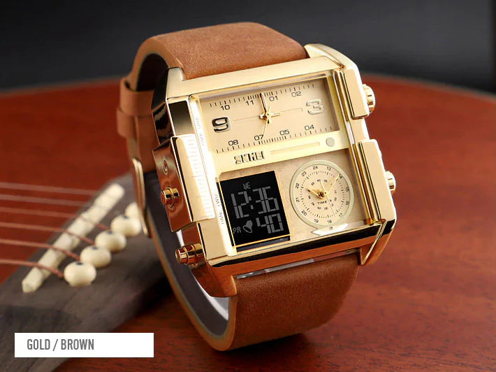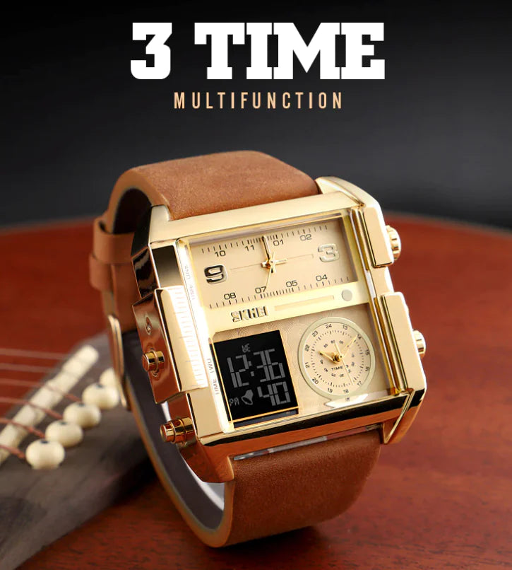 Unique cool triple time display dials with stopwatch and alarm and date and 12/24 hour format, LED large face dial with the classic genuine leather band, simple and grand, expressive of your extraordinary taste.
