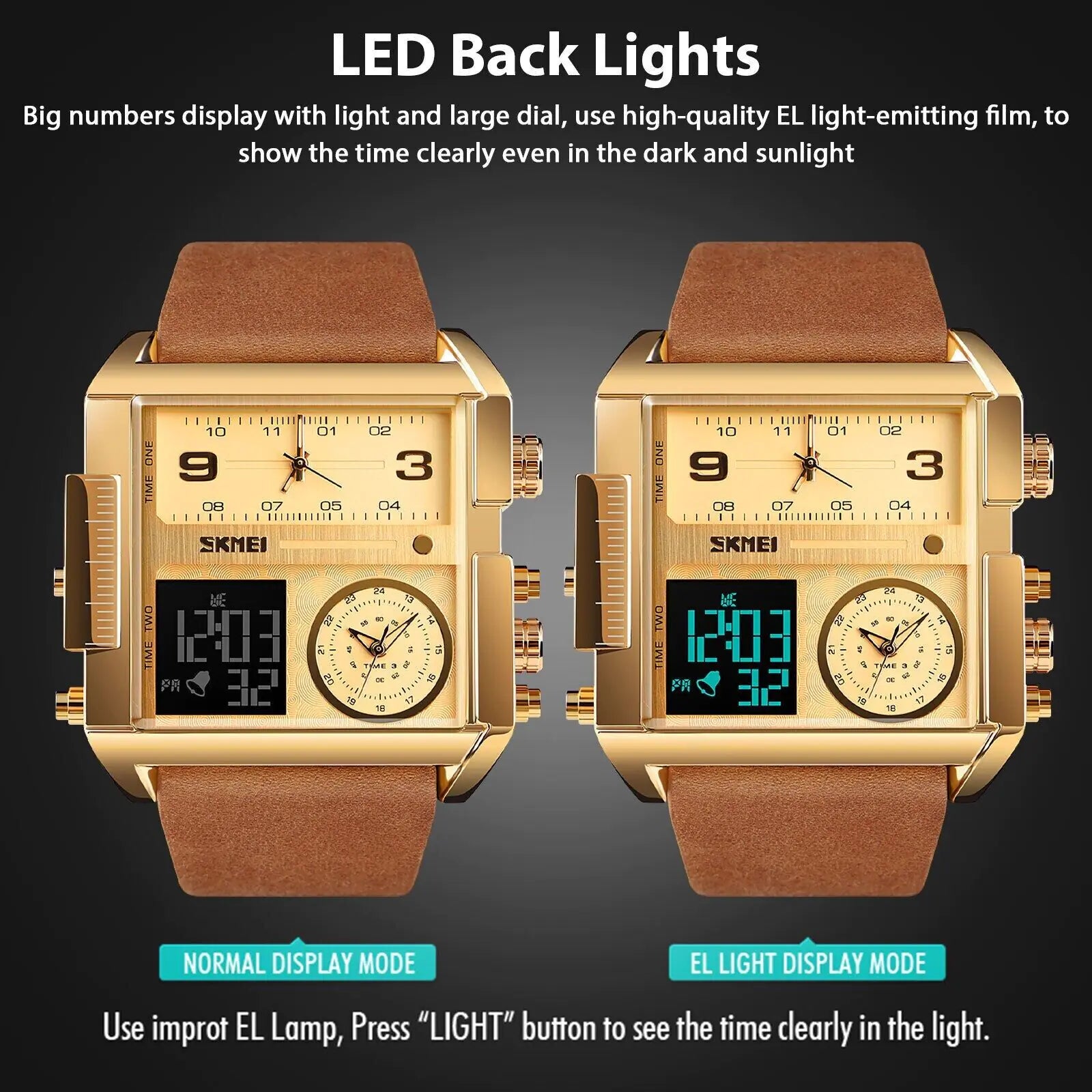 SKMEI Men Watch Large Dial Digital Quartz Sport Stopwatch Leather Wristwatch New