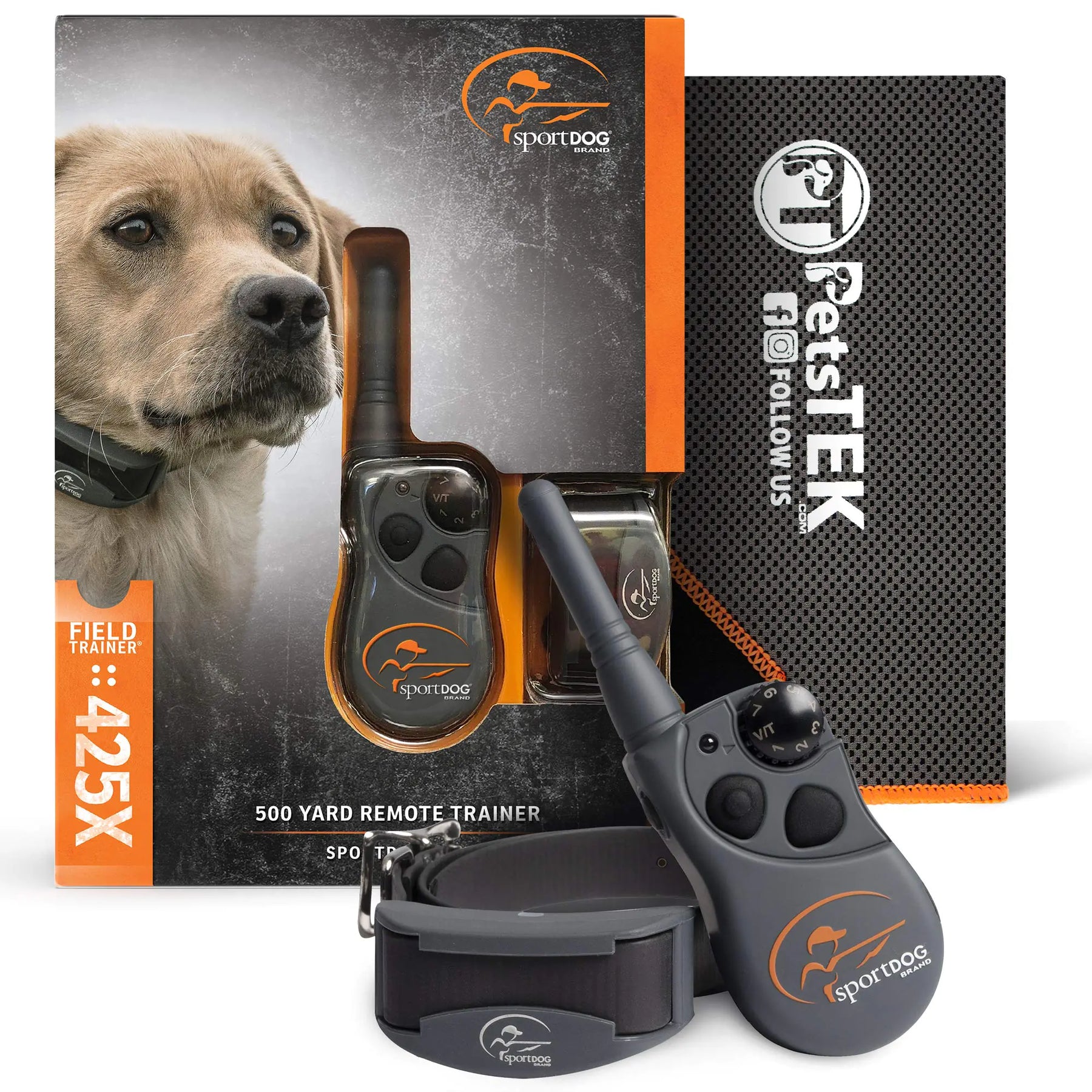 SportDOG Brand Field Trainer SD-425X Remote Dog Training E-Collar System - With PetsTEK Multipurpose TowelSportDOG SD-425X remote training dog collar is a safe and effective system for behavior and fieldwork training. This remote dog trainer is an excellent choice for basic obedience training entry-level fieldwork hunting and camping. The system is expandable to two or three dog system with additional collars that you can purchase separately.The SportDOG SD-425X - Handheld Transmitter is designed with you in mind. Static stimulation tone and vibration buttons are customizable to best suit your and your dogs training style. The convenient front-facing Intensity Dial with 7 stimulation levels can be controlled with one hand. Focus on dogs in action and not on the equipment.Features:- Safe Effective and Humane Remote Dog Trainer with 3-Training Modes:--- 21 Stimulation Levels Nick/Continuous Correction--- Vibration--- Tone- Ergonomic Remote Transmitter:--- Front-facing Intensity Dial for one-handed operation--- Seven selectable stimulation levels--- Up to 500-yards range- Small and Light Receiver Collar:--- Designed for small to large dogs 8 lbs. and up--- Fits neck size between 5” and 22”- Remote Transmitter dimensions - 5.3”L X1.7”W X 1.0”D- Receiver Collar dimensions without strap - 2.6”L X 1.3”W X 1.23”D- Rechargeable batteries with a quick 2-hour charge- IP67 Waterproof and submersible up to 25ft- Package contents: Remote Transmitter Collar Receiver on 3/4" collar strap lanyard charging adaptor standard contact points long contact points basic training manual test light and PetsTEK multipurpose pet towel