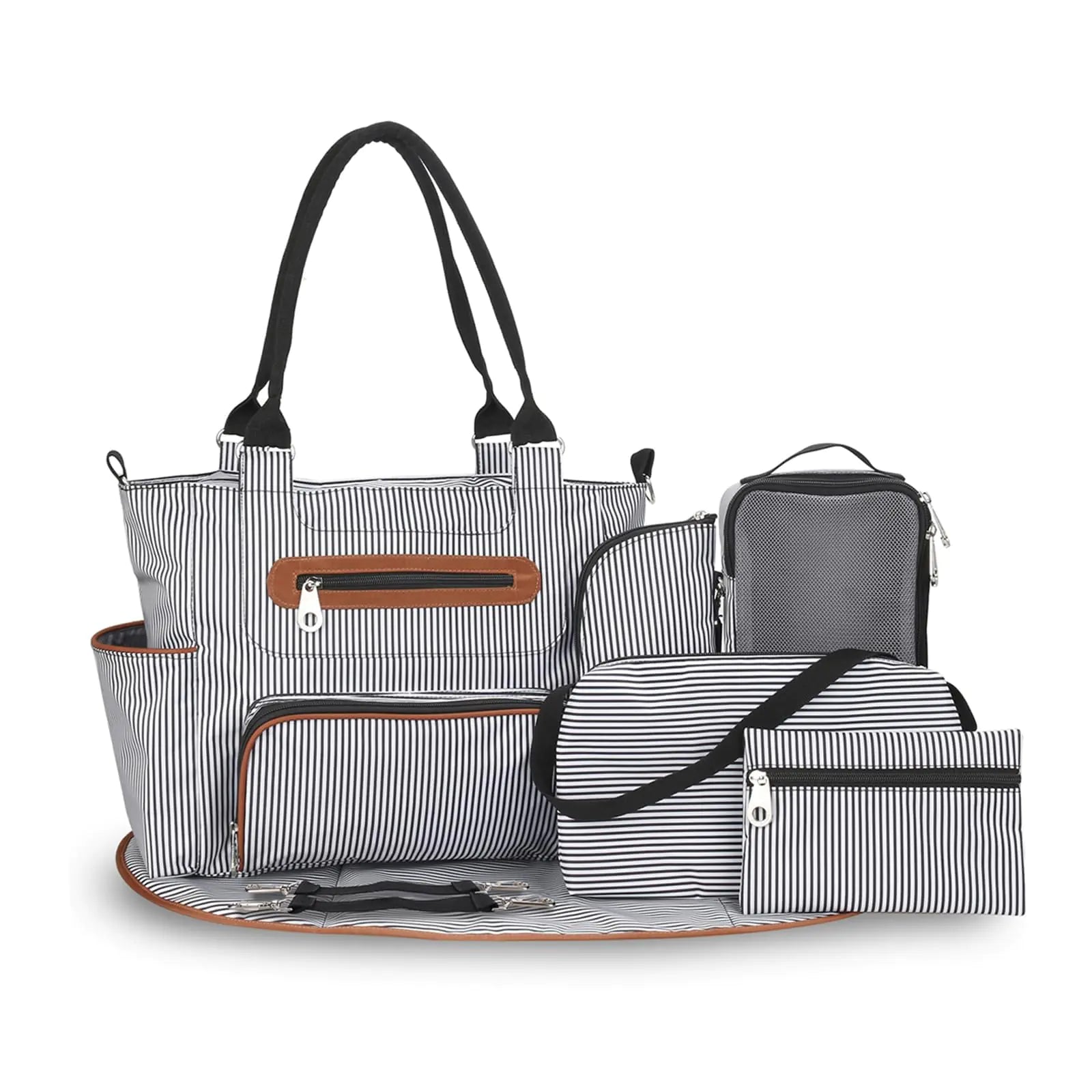 KOCASO Multifunctional Baby Diaper Bag Set - 8Pcs Baby Nappy Diaper Bags for Mom and DadDiaper Tote with Bottle Bag Mesh Bag Purse Diaper Pad 2 Burp Cloths 2 Hook Straps(BlackStripe)