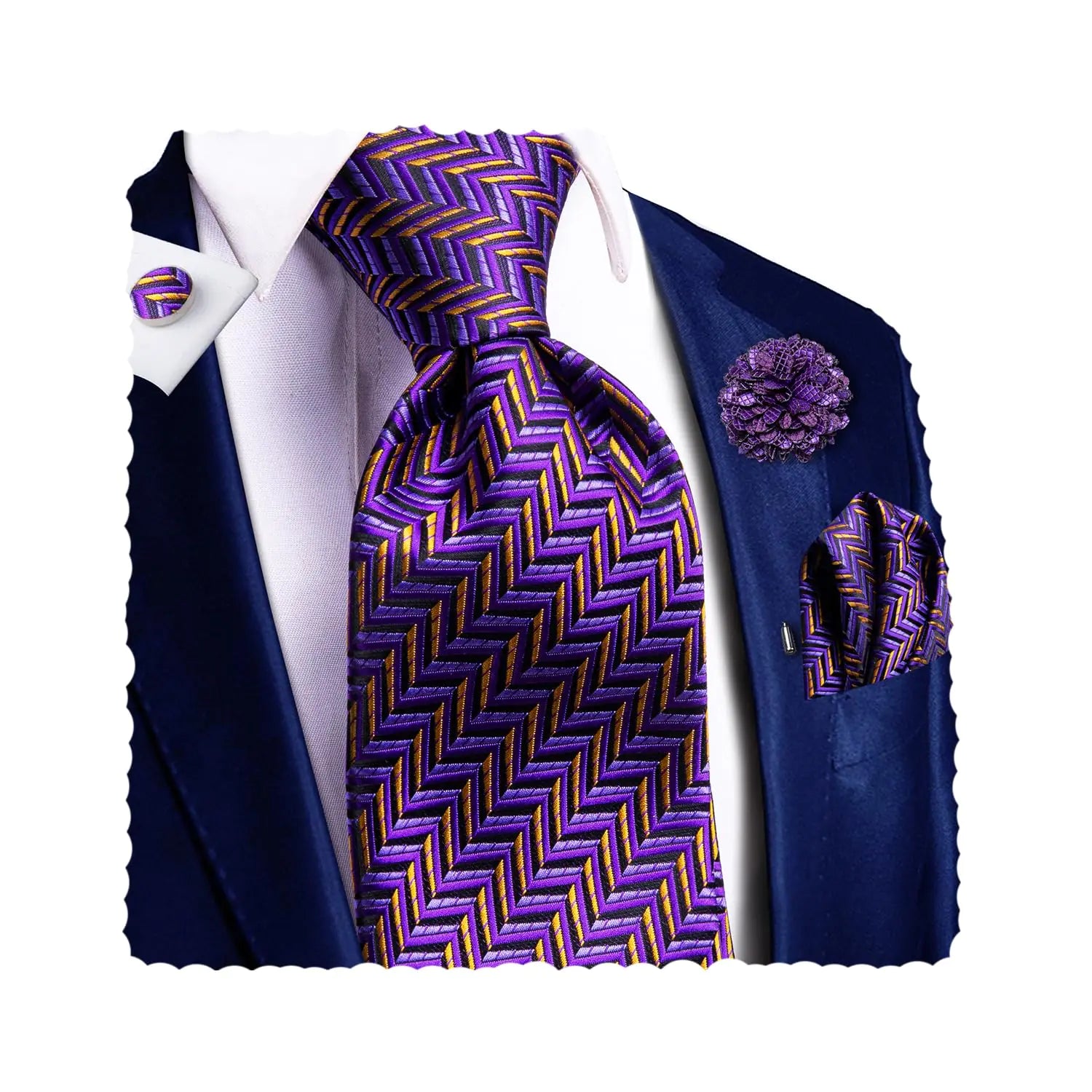 Hi-Tie Mens Silk Ties Lapel Pin Handkerchief Cufflinks Set Striped/Paisley/Floral Necktie Sets Wedding Business PartyPurple Stripe