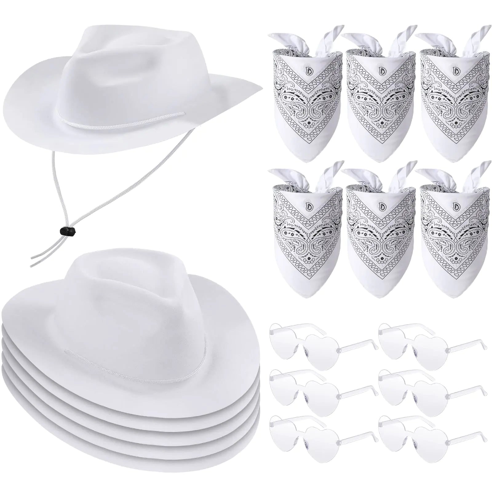 Newcotte 18 Pcs Western Cowboy Plastic Hat Set Include 6 Hats 6 Paisley Bandanas 6 Pairs Heart Style Glasses for Party(White)