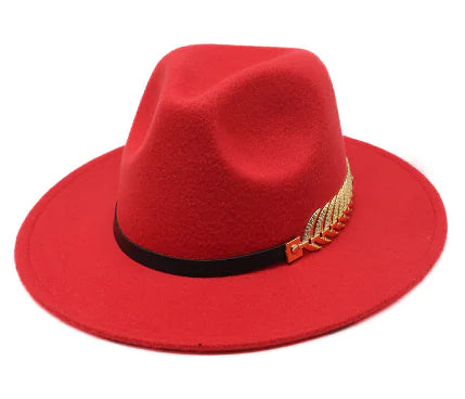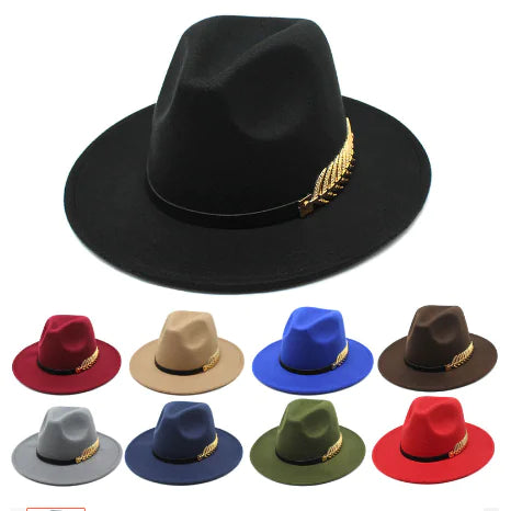The hat features a sophisticated metal leaf design that adds a touch of glamour, perfect for both casual outings and more formal events. Available in a variety of fashionable colors including Red, Black, Blue, Navy Blue, Army Green, Coffee, Wine Red, Grey, and Camel, you can select the perfect shade to match your wardrobe.