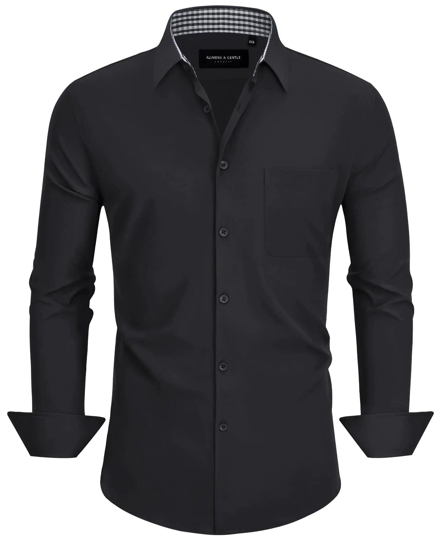 Alimens & Gentle Mens Dress Shirts Black Long Sleeve Button Down Shirt Men Wrinkle Free Shirts Plaid Collar