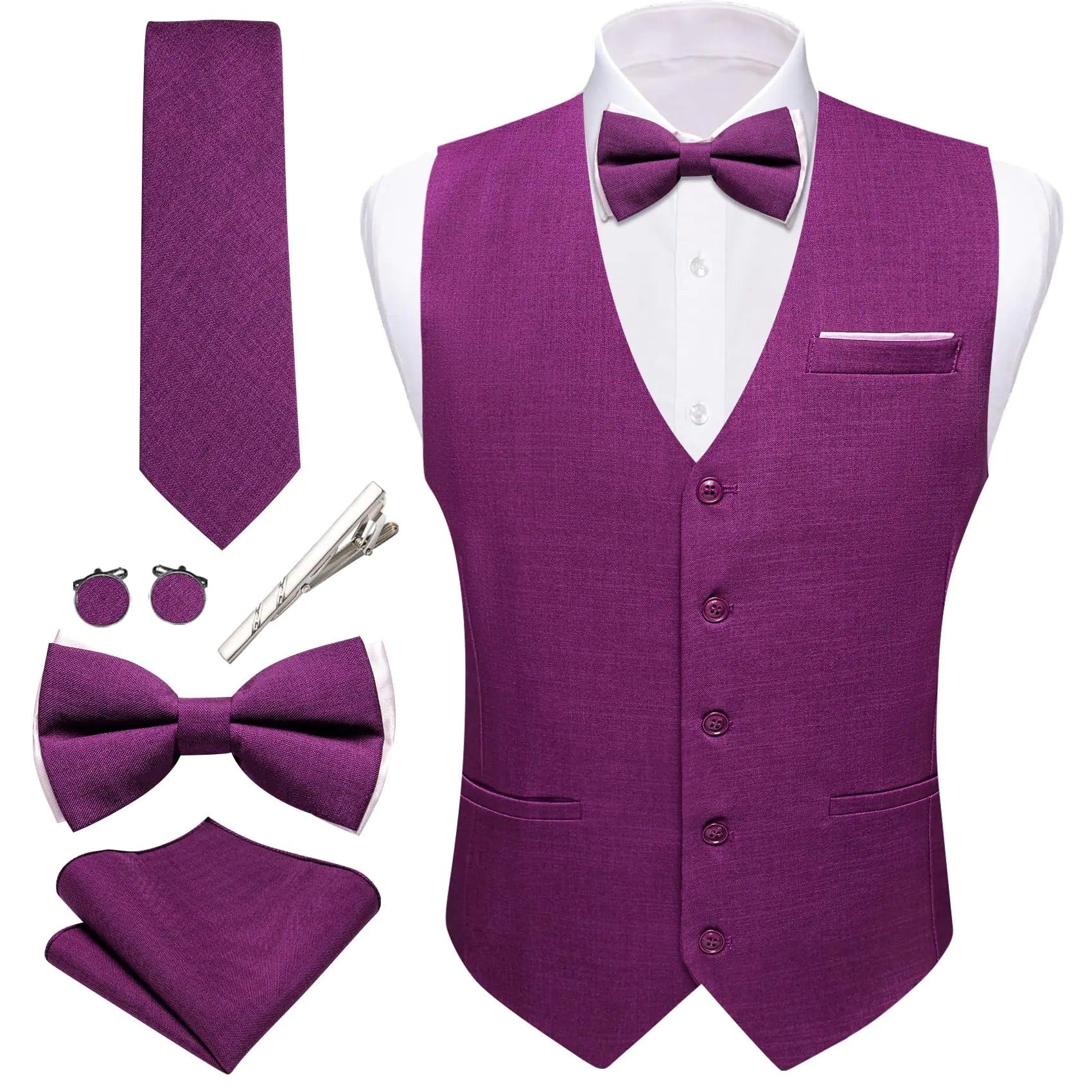 Barry.Wang Mens Purple Suit Vest Linen Formal/Casual Waistcoat Tie Bow Tie Set Wedding Party