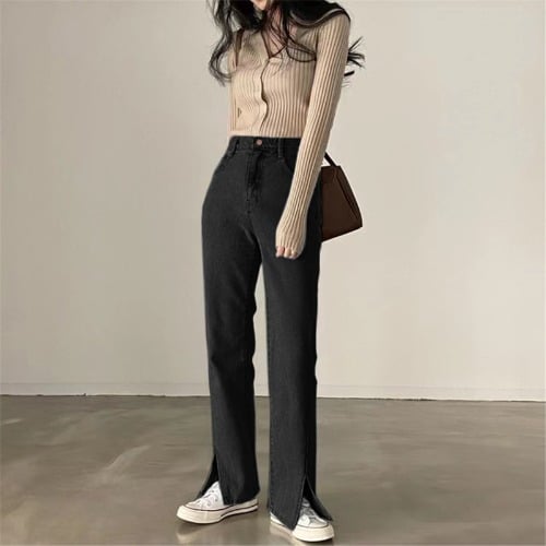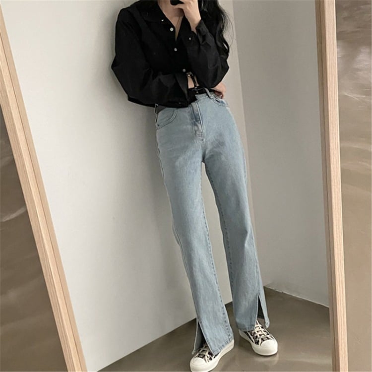 Step into the world of fashion with our stunning Korean Version of Ins Fashion High-waisted Slits jeans. These high-waisted, wide-leg pants are designed to elevate your style and offer maximum comfort, making them a must-have in your spring wardrobe.