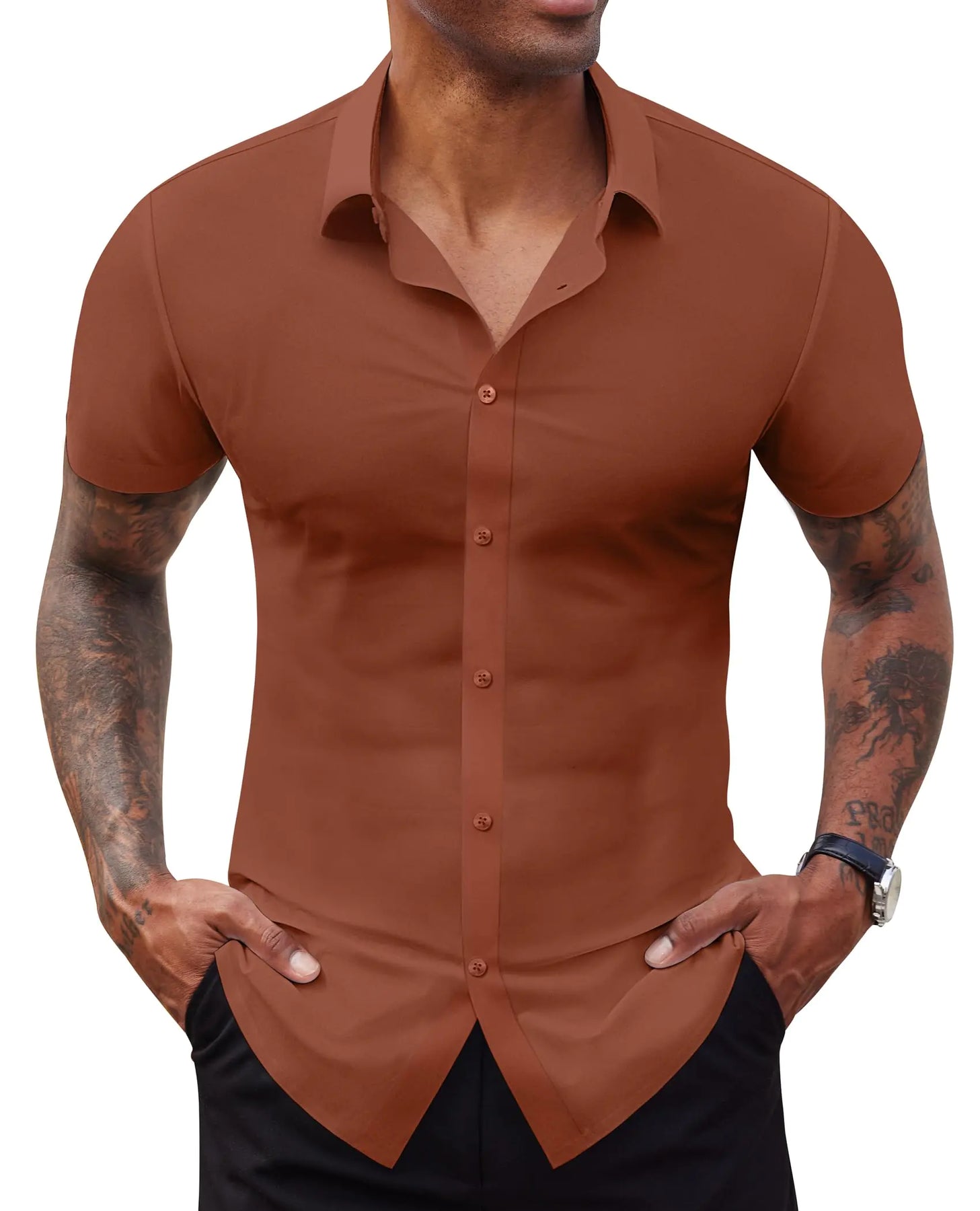 Lion Nardo Stretch Dress Shirts for Men Short Sleeve Slim Fit Casual Button Down Shirts Muscle Fit Mens Dress Shirts Brown