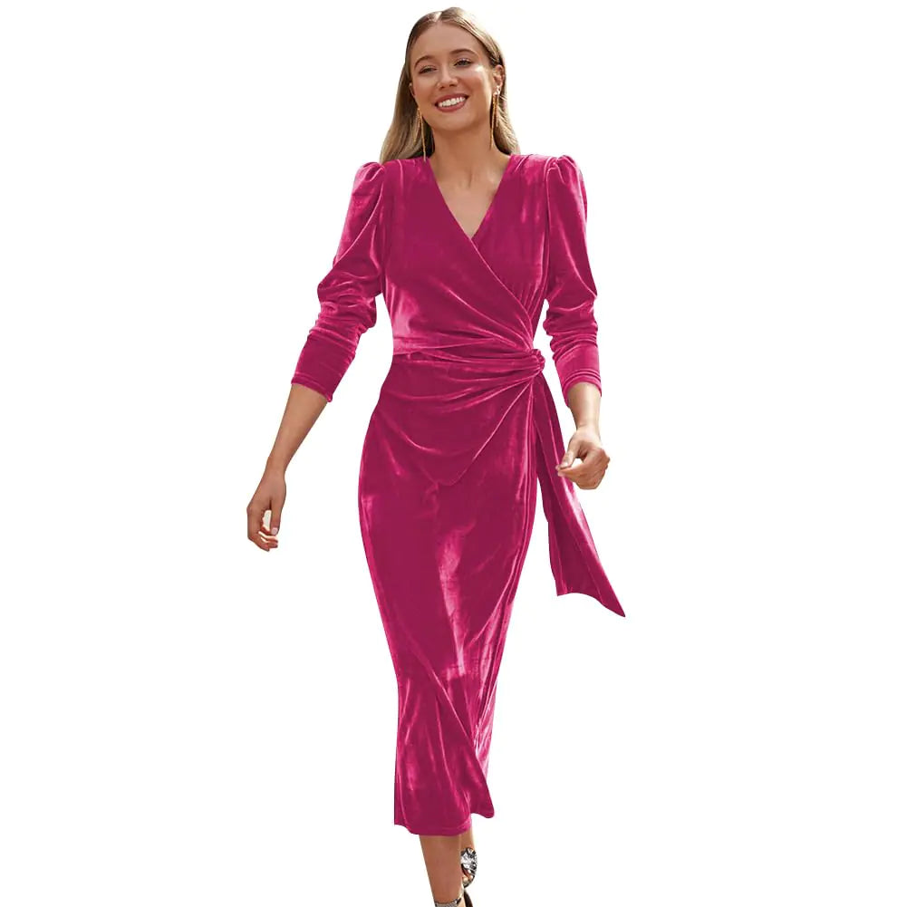 Long Sleeve Velvet Dresses for Women Formal Elegant Velvet Wrap Dress Fall Winter Wedding Guest Dresses For Women V Neck A Line Ruched Bodycon Midi Dress Evening Party Bridesmaid Dress Hot Pink XL