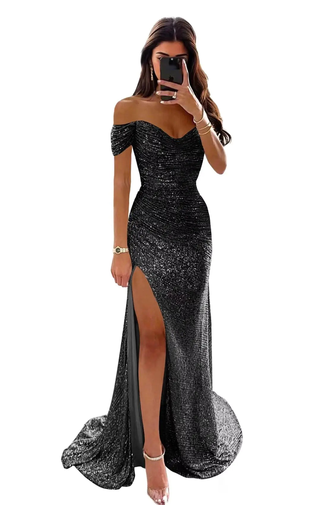 [Features: The Elegant Sparkly Sequin Prom Dress features Off Shoulder Mermaid with Slit Ruched Cowl Neck Sleeveless Zipper Back Floor-Length Fully Lined Built-in Bra Occasion: Sequin Mermaid Prom Dresses with Slit perfect for Prom Dress Formal Dress Evening Party Dress Graduation Gown Ball Gown Cocktail Dress Bridesmaid Dress Wedding Guest Dress Mother of the Bride Dress Pageant Christmas Ceremony Red Carpet Birthday First Communion etc About Size: Please refer to our left size chart ingore the Amazon size chart. If you are uncertain about the size you can provide us with your own measurements of the bust waist hips and hollow to floor by email. We can help you find the perfect fit size Customize Service: Color and size customization is available if you want to custome this Sparkly Off Shoulder Prom Evening Gown please contact us by email and offer us your mesurement: bust waist hips and hollow to floor Service: If you have any questions about this Off Shoulder Mermaid Sequin Prom Dresses with Slit please feel free to contact us we will try our best to provide you a best solution]