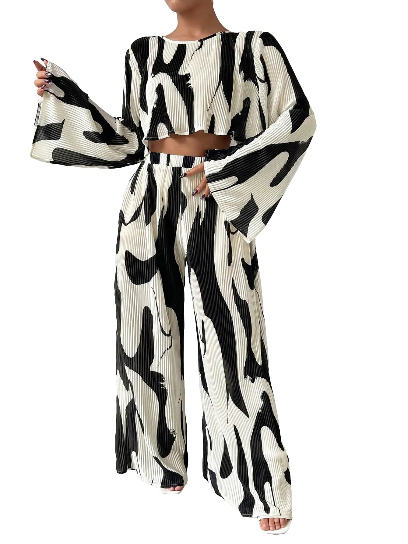 Verdusa Womens 2 Piece Sets Dressy Brunch Outfits Bell Sleeve Pleated Crop Top Pants Sets Business Casual Outfits Black and White Large