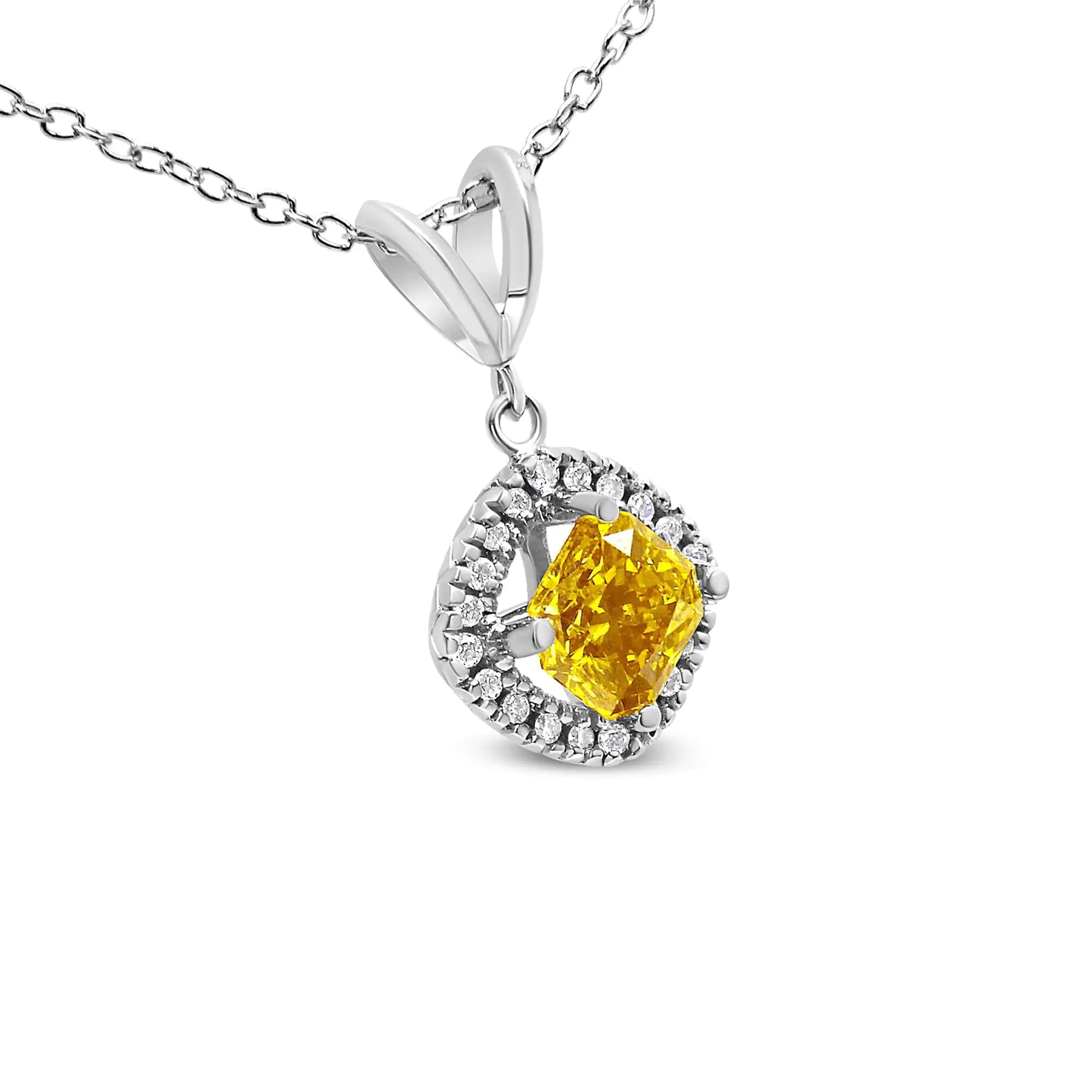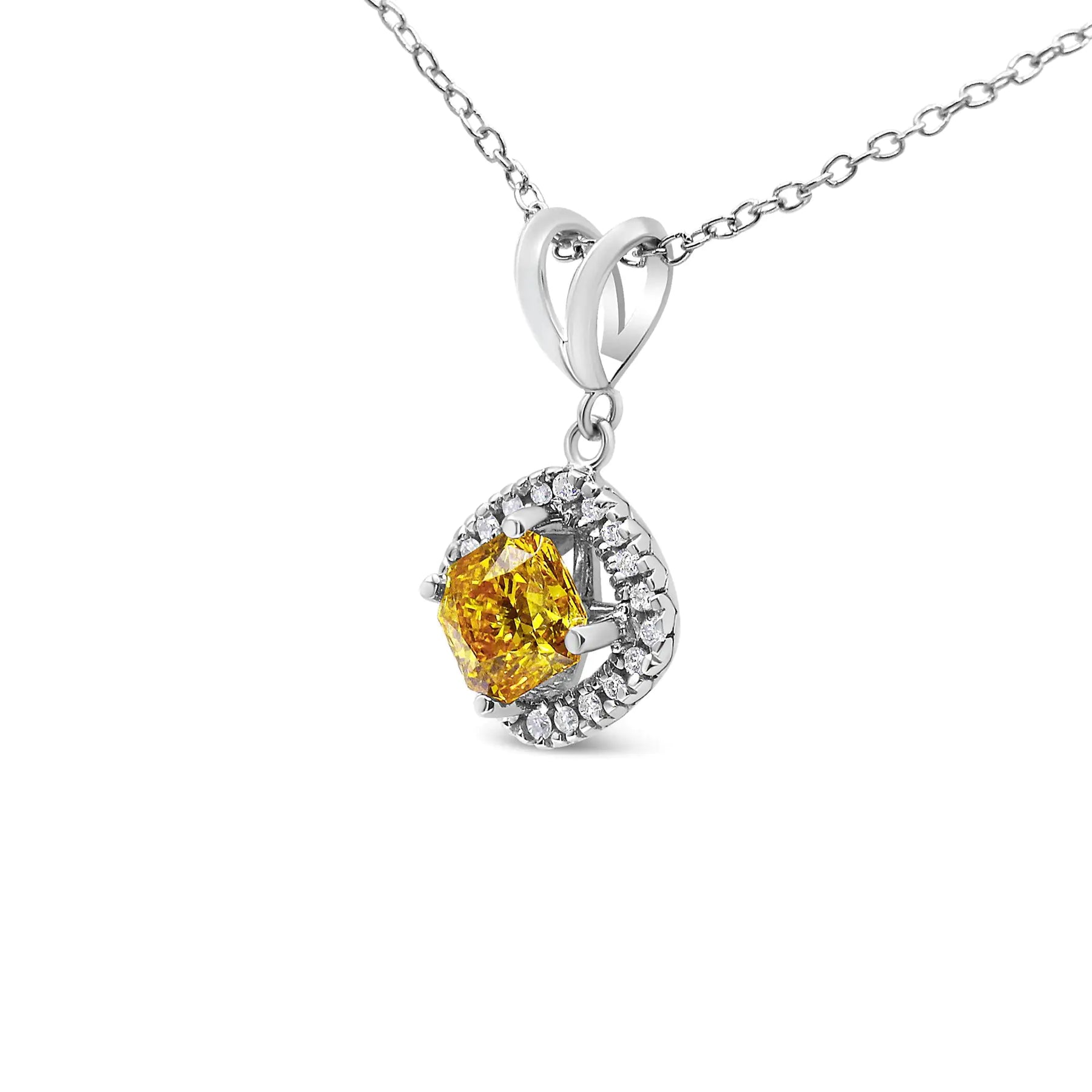 Be the queen of the scene with this dazzling lab grown radiant cut yellow diamond pendant. This darling necklace features a solitaire center diamond elevated above a halo of lab grown diamonds and is crafted from cool 14k White Gold. This pendant features a 1 carat lab grown radiant yellow diamond flanked by 20 lab grown white diamonds. The pendant comes with an 18" Inch 14K white gold box chain with a spring. This piece is guaranteed to bring blinding dazzle to your collar.