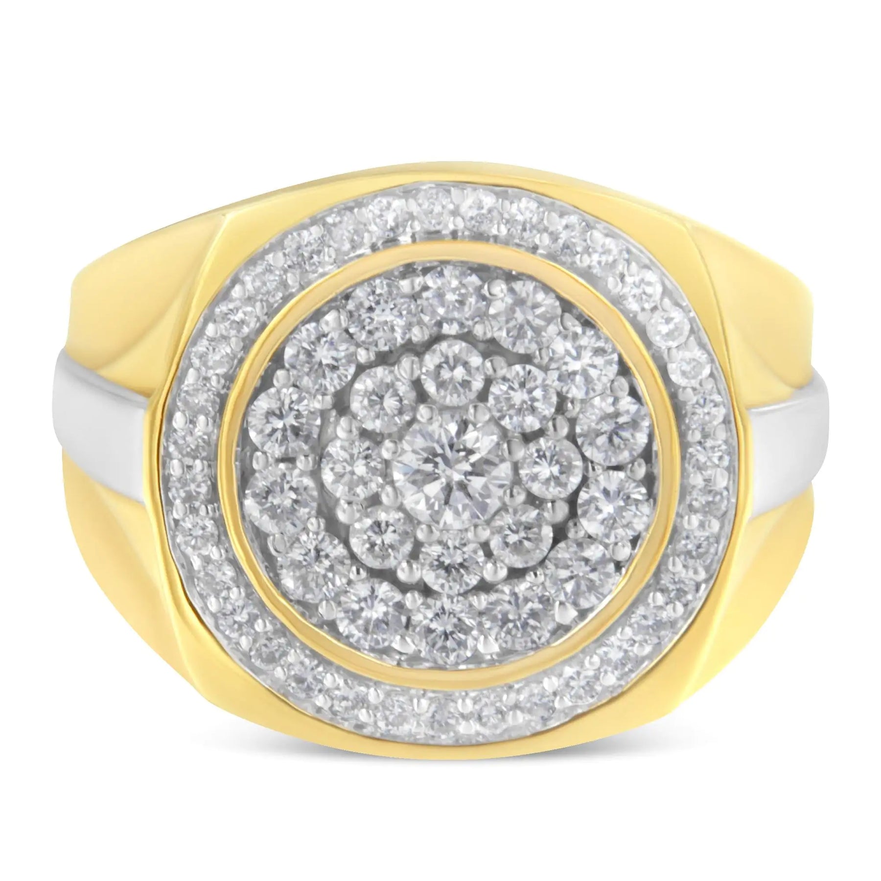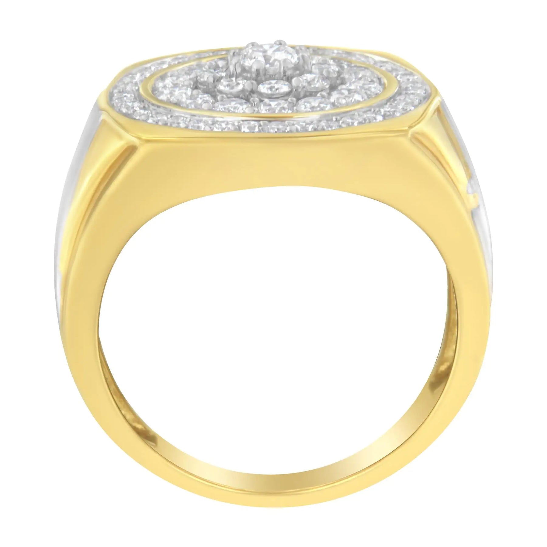 A diamond cluster gent's band crafted in warm 14k yellow gold. A central circled cluster of round diamonds adds sparkle to this elegant design. It is surrounded by a circled halo of round diamonds and set in a squared design. This wide men's band features a contrasting design crafted in 14 karat gold.
