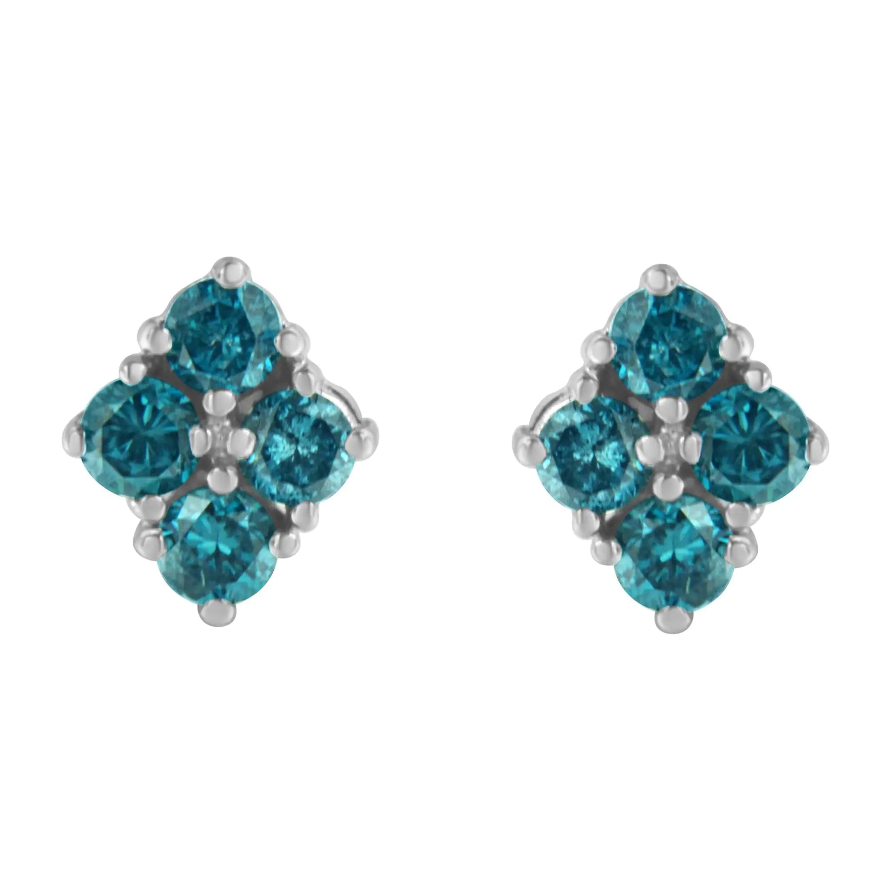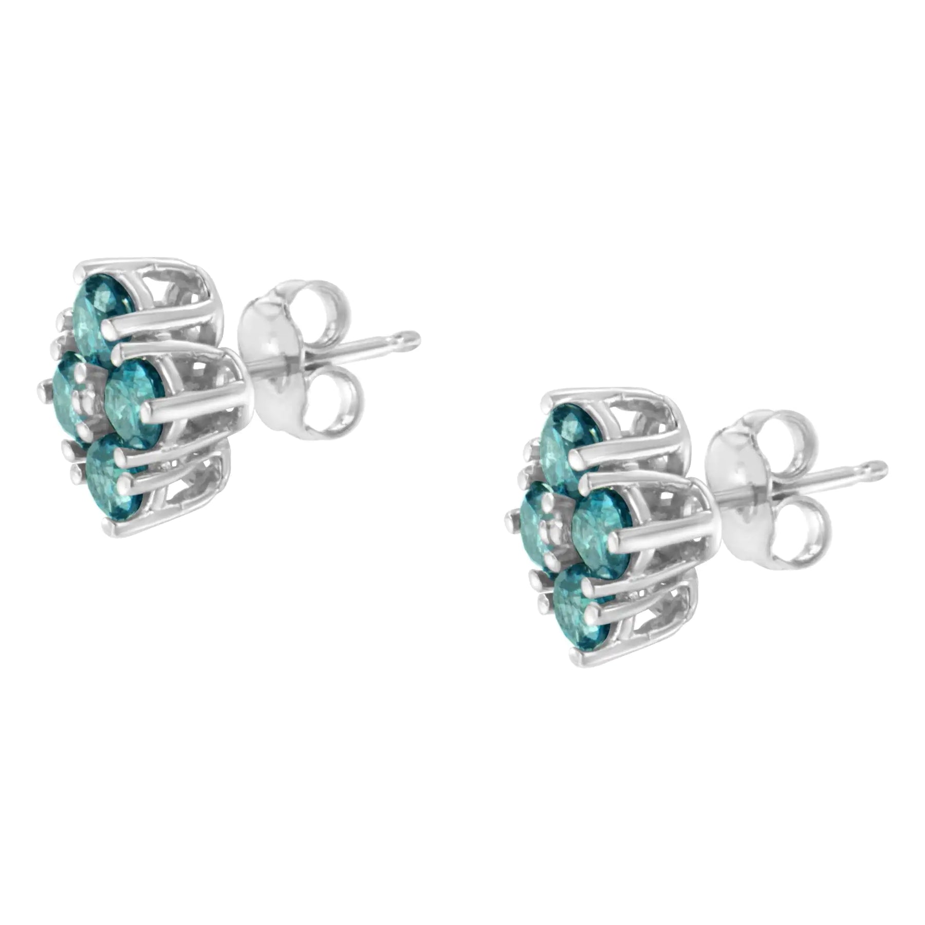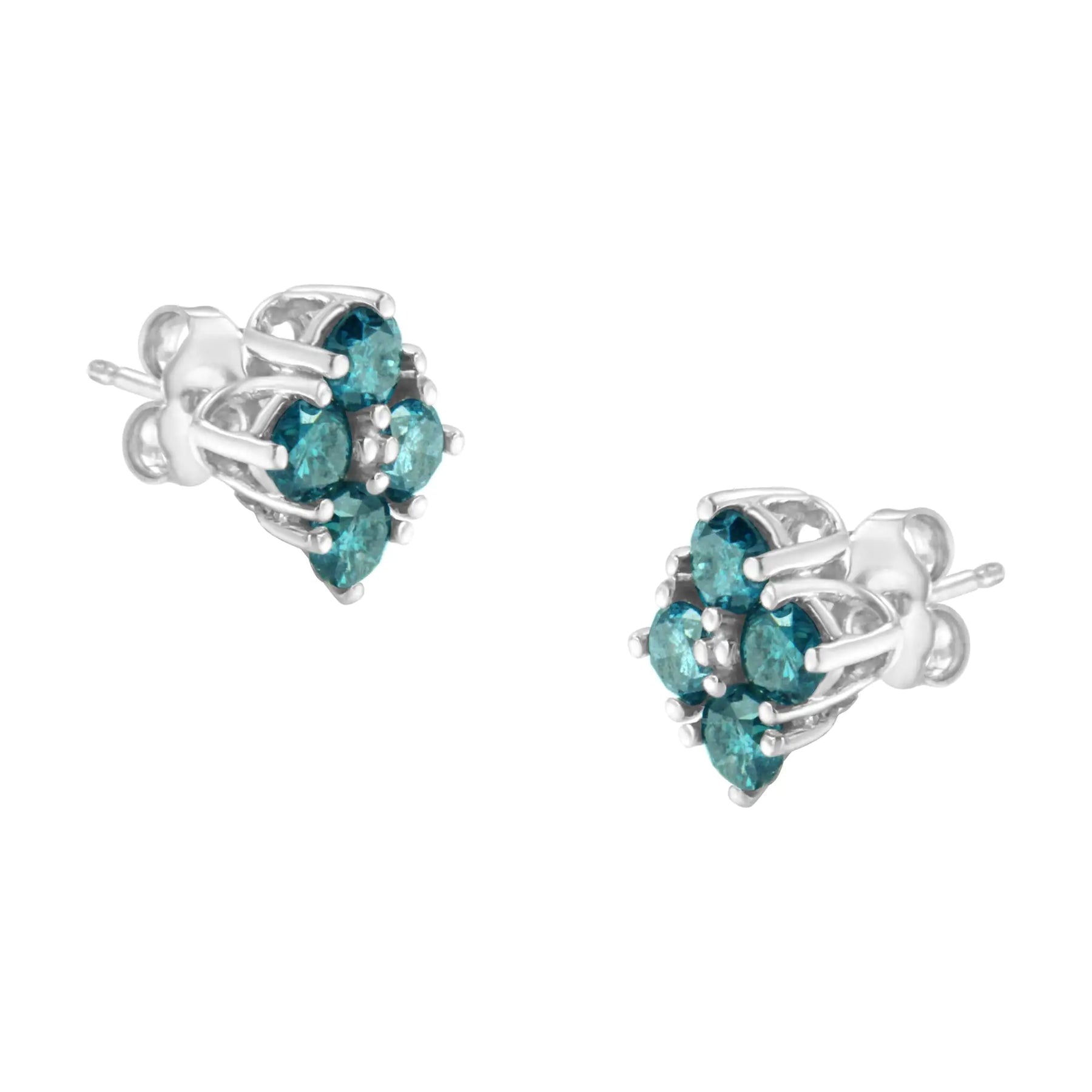 A pair of diamond stud earrings with clusters of four blue treated diamonds. Crafted in 14 karat white gold, they have a total diamond weight of 1 1/2 carats.