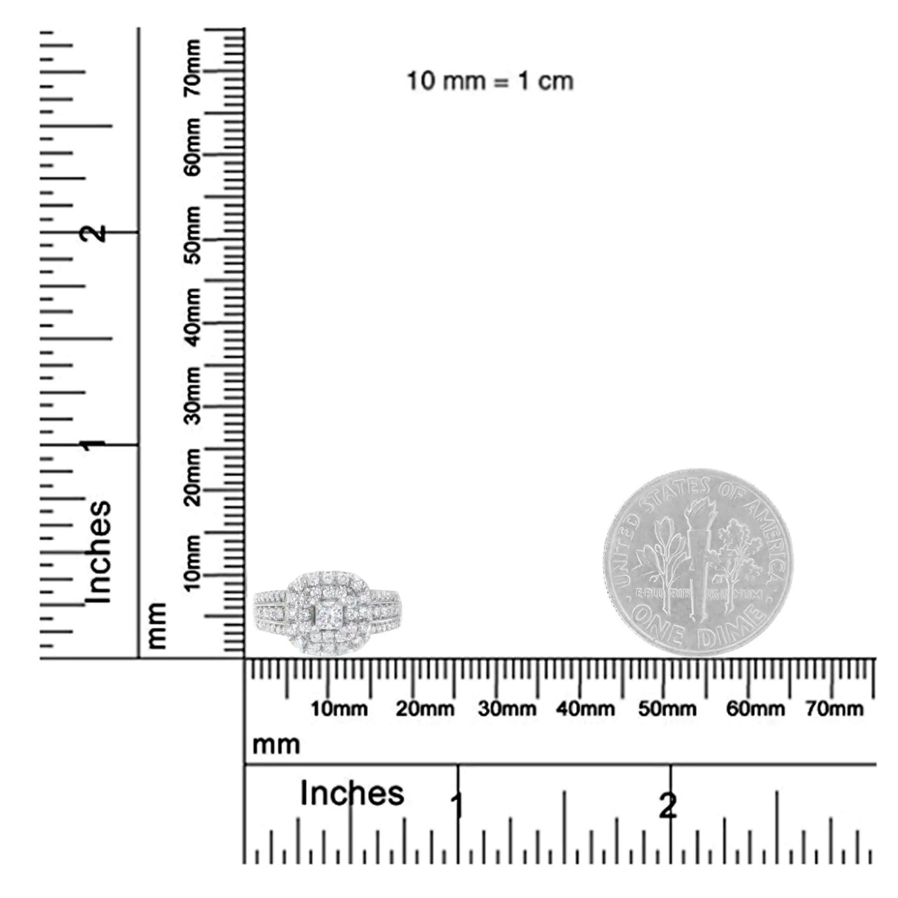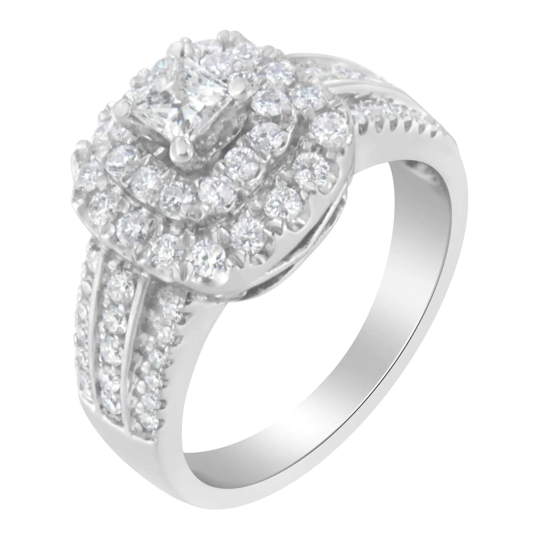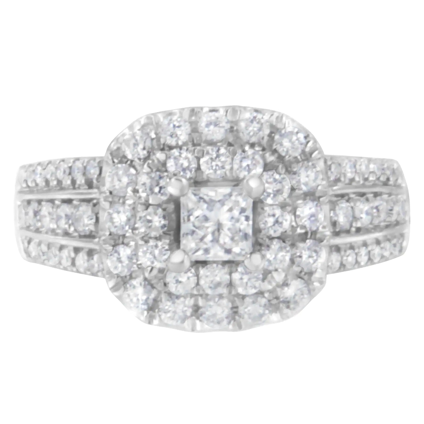 A diamond cluster ring that glimmers with a central princess cut diamond surrounded by a double halo of round diamonds. The wide band is crafted in 14 karat white gold and sparkles with three rows of round diamonds. The total diamond weight is 1 carat. This is a one-of-a-kind ring, and will be a unique addition to your jewelry collection.