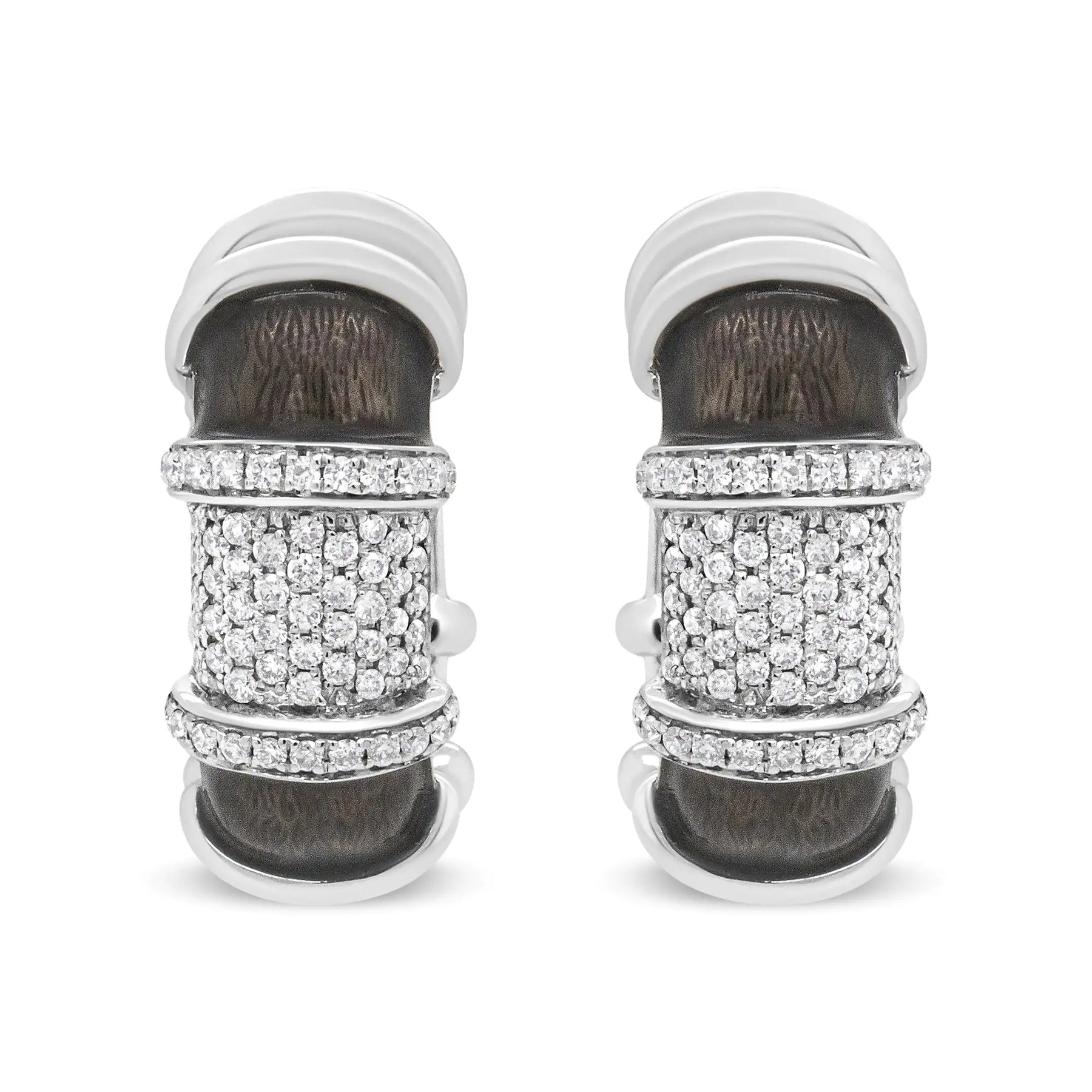 18K White Gold Flash Plated .925 Sterling Silver Clear Graphite Grey Enamel 5/8 Cttw Round Diamonds Huggie Hoop Earrings (F-G Color, VS1-VS2 Clarity)