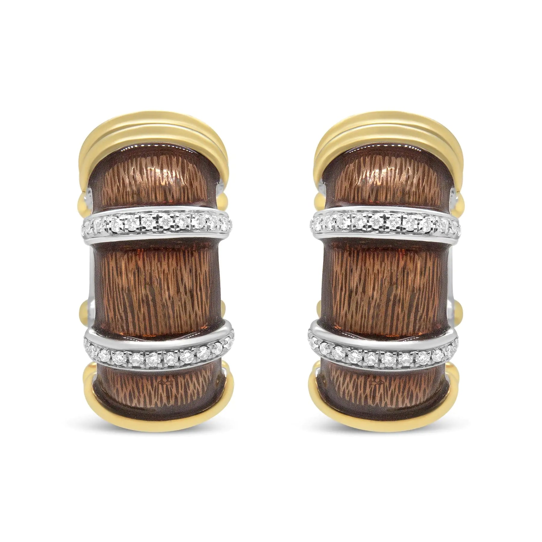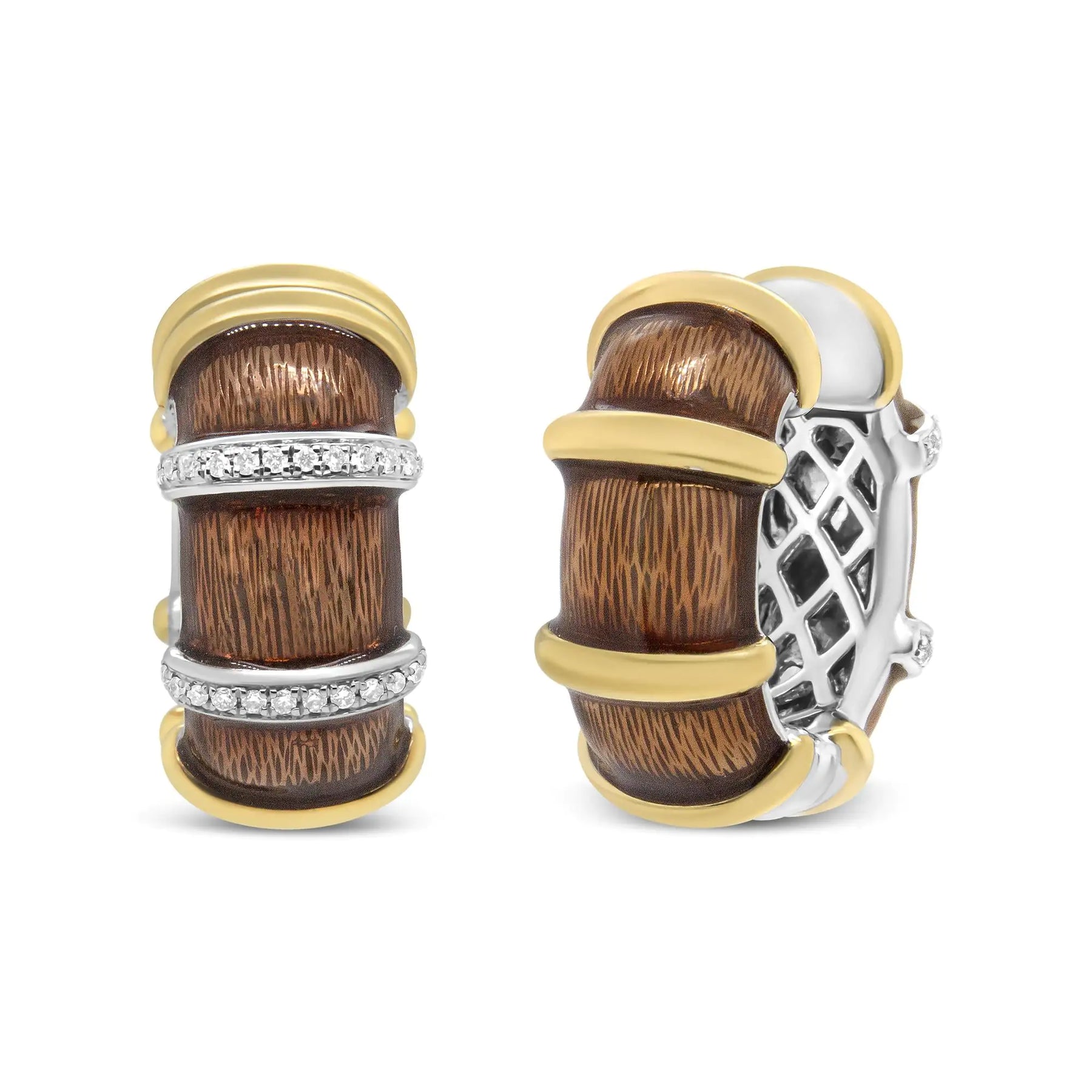 Add color to your jewelry collection with these huggie hoop earrings made from 18k yellow and white gold flash plated .925 sterling silver with clear brown enamel. These evocative earrings are rich in color as they are intricate metalwork. Rows of prong-set round diamonds add brilliant sparkle to the pair's aesthetic, creating a look that is unique to you. These diamonds total 9/10 cttw with an approximate F-G Color and VS1-VS2 Clarity. Latch findings keep these pierced earrings safe and secure on the ears for comfortable, worry-free all day wear.