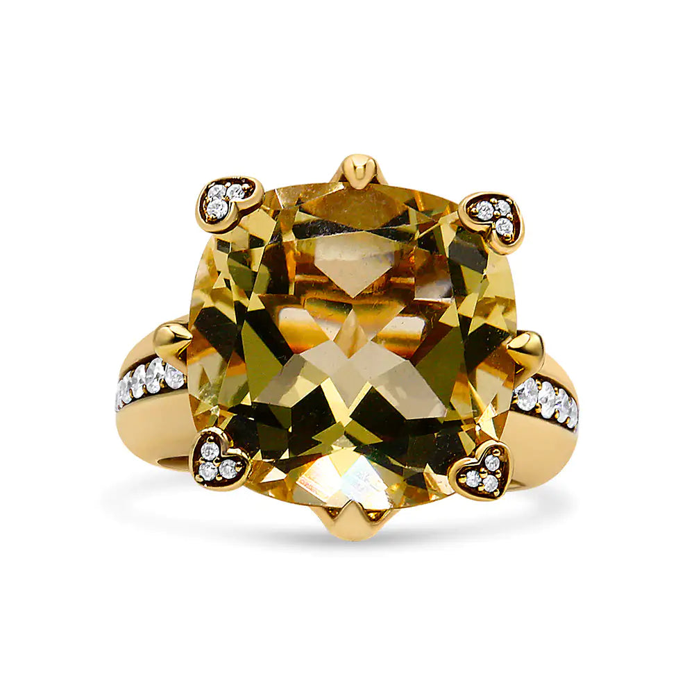 Turn heads with this lemon quartz and diamond cocktail ring. The solitaire cushion-checkered cut lemon quartz is set with 4 heart shaped prongs; each prong has a small trio of 3 white diamonds. The diamond trio magnifies the focus back on the lemon quartz, as the prong set diamonds flash through the light drawing everyone’s eyes to the ring. The entire piece is crafted from warm 18K yellow gold and the ring shank features two channels of prong set white diamonds for additional spark. The lemon quartz is 15 x 15mm and the total diamond weight of this ring is ¼ ct. tdw.