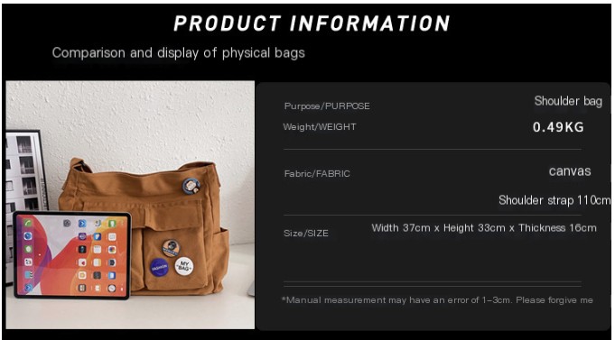 Whether you're heading to class, a weekend getaway, or just running errands, this spacious bag measures 60cm in height and 39cm in length, with a width of 35cm. Weighing in at just 0.49kg, it’s lightweight yet robust enough to carry all your necessities.
